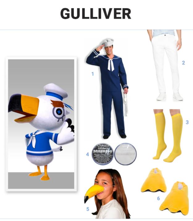 Cosplay een cartoon zeemeeuw verkleed als een matroos. Deze unieke combinatie is niemand minder dan Gulliver uit de populaire Nintendo-videogameserie Animal Crossing. Verkleden in een stereotiepe blauwe matrozenoutfit met de traditionele flapkraag. Maar je moet wat witte gezichtsverf als basis toevoegen voordat je de juiste vogelaccessoires toevoegt. Om de vogelachtige eigenschappen van Gulliver te krijgen, heb je een gele snavel, gele sokken en gele voeten nodig. Perfect voor op het strand, maar nog beter voor een [Halloween] kostuumfeest.