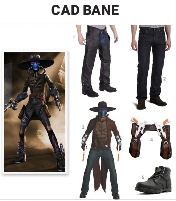 Vaak ingehuurd door enkele van de meest verschrikkelijke schurken in de melkweg voor banen die niemand anders zou durven, staat Bane bekend als een effectieve jager. Hij slaagde er zelfs in het Senaatsgebouw op Coruscant te infiltreren en een groep senatoren te gijzelen in een poging Ziro the Hutt uit gevangenschap te bevrijden. Als je het uiterlijk van intergalactische premiejager Cad Bane wilt krijgen, moet je een Cad Bane-kostuum, herenjeans, leren chaps, speelgoedgeweren en werklaarzen kopen.