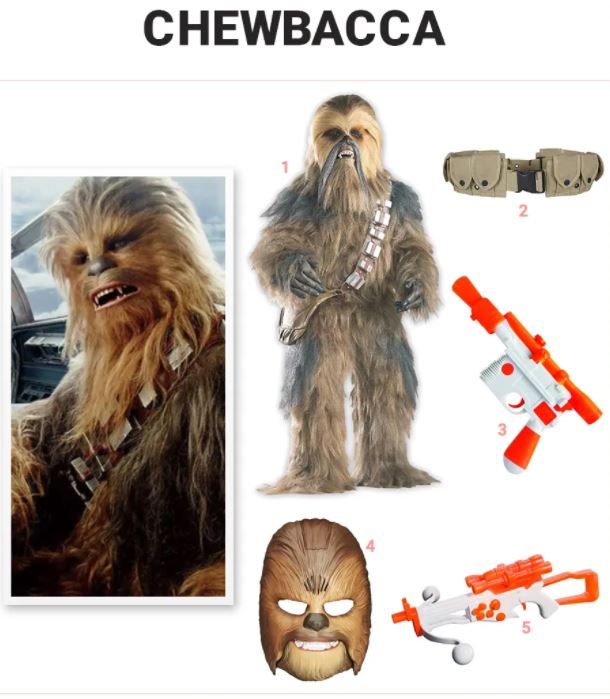 Chewbacca gebruikt minimale accessoires: een bandelier en zijn favoriete wapen, de Wookiee Bowcaster. Als je de Chewbacca-kostuumset al hebt, heb je geen andere accessoires nodig. Misschien een paar blauwe contactlenzen als je een andere oogkleur hebt. Blauw was de natuurlijke oogkleur van Peter Mayhew, die het originele Chewbacca-pak aantrok in de Star Wars-franchise.