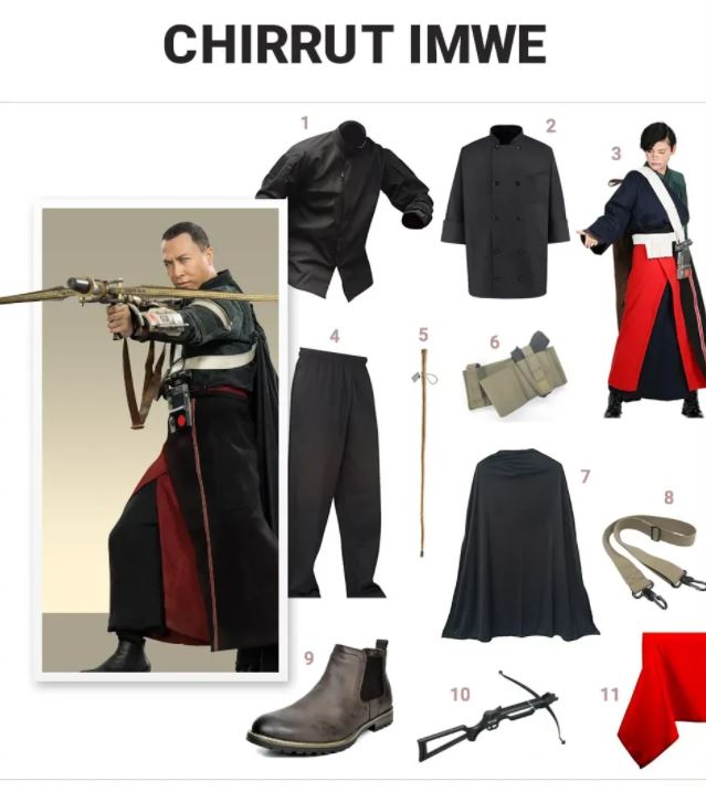 Een stuk rode stof, of zoals de cadeaugids suggereerde een tafelkleed, kan worden gebruikt om je middel te wikkelen. De witte schouderriem die hij draagt, lijkt vreemd genoeg op iets dat de veiligheidspatrouille van een school zou kunnen dragen. Dit kan zonder twijfel worden besteld of nagemaakt met witte ducttape. Je kunt kiezen voor de houten staf van Chirrut Imwe of zijn boog. Groepscosplay is eenvoudig en kan K-2SO, Jyn Erso of Darth Vader uit Star Wars bevatten.