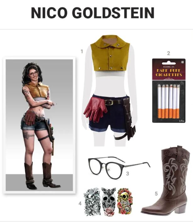 Nico Goldstein is niet je gebruikelijke meid. Ze vindt het niet erg om vies te worden en staat altijd klaar om haar gereedschap op te pakken om een vriendin te helpen. Ze is een leuk personage om te cosplayen als je een ander personage wilt zijn dan de gebruikelijke Devil May Cry-jagers. Je zou verbaasd zijn hoeveel van Nico's kostuum je misschien al in je kast hebt. Als je items mist, zou je de rest in een kringloopwinkel moeten kunnen krijgen.