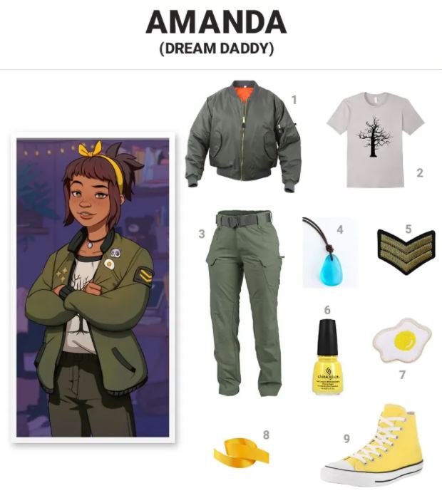 In het spel Dream Daddy: A Dad Dating Simulator van Game Grumps heeft Amanda Ann al één vader, maar wordt ze nu geconfronteerd met de kans om nog een geweldige vader te hebben of mogelijk een vader die haar leven kan ruïneren! De 18-jarige dochter is een laatstejaarsstudent die ervan droomt om naar school te gaan voor kunst en fotografie, maar zal dat allemaal instorten op basis van wie daarna in haar familie komt? Amanda is de dochter van de speler met een donkere huid met sproeten op haar wangen en bruin haar dat ze in een paardenstaart draagt. Krijg het uiterlijk van de aspirant-fotograaf met deze Amanda-kostuumgids.