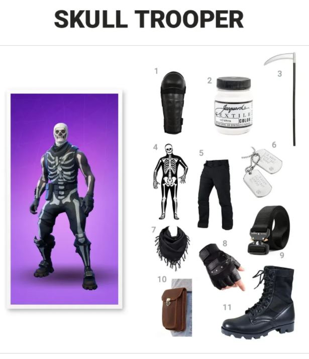 Skull Trooper draagt in wezen een zwart militair pak met een dreigend wit skelet erop geschilderd. Je kunt jezelf gemakkelijk uitrusten met de hele set, die een Full Body Lycra-pak, Sjaalomslag, Tactische Broek, Tactische Riem, Echte Lederen Handschoenen, Militair Leger Dog Tag, Heuptas, Harde Scheenbeschermers, Jungle Boots en Textielverf bevat om aan te brengen naar het sikkelaccessoire. Met deze Fortnite-look ben je een lust voor het oog om degenen die je op Halloween ziet te terroriseren!