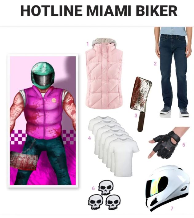 Creëer een geweldige Hotline Miami-cosplay met deze Biker-kostuumgids. Deze geweldige cosplay moet een gewatteerd vest, Levi's jeans en een wit T-shirt bevatten. Zijn accessoires zijn onder meer een nep bloedig hakmes, leren handschoenen, motorhelm en een schedelpatch om op je vest te plaatsen.