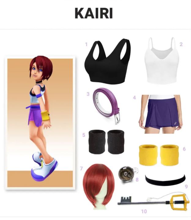 Om Kairi te cosplayen, begin je met het dragen van een damespruik om een mooi kapsel te krijgen dat lijkt op Kairi. Doe vervolgens de magische Black Choker Necklace om. Voor haar kleding moet je een sportbeha, mouwloze damestanktop, tennisrok voor dames en een taillejurkriem dragen. Maar dit is niet het einde van haar outfit. Kairi's kleding is echt kleurrijk. Vergeet dus niet gele katoenen polsbandjes en zwarte katoenen polsbandjes te dragen. Trek ten slotte de magische hangerketting aan voor uw bescherming en rust de Giant Fantasy Key uit. Bewonder nu je prachtige Kingdom Heart-look.