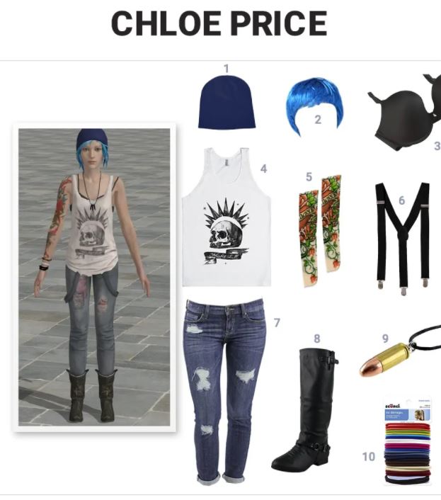Chloe Price heeft haar eigen gevoel voor stijl, gelukkig voor cosplayers, het is vrij gemakkelijk om te zien om te doen. Een aantal accessoires kan online of bij een plaatselijke kostuumwinkel worden opgehaald. Een pruik om haar blauwe haar te accentueren is essentieel, evenals tatoeages op de mouwen en een modieuze halsketting. De rest van haar look vind je waarschijnlijk in je eigen kast.