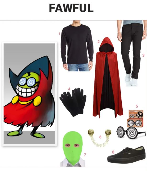 Krijg het uiterlijk van een schurk voor Mario en Luigi met deze Fawful kostuumgids. Verkrijg de beste Fawful-outfit door je te kleden in een zwart shirt met lange mouwen, rode mantel, zwarte broek, zwarte handschoenen, zwarte sneakers, gezichtsmasker, gouden mantelketting en Hypno betoverende bril.