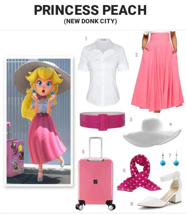 Wil je je verkleden als Princess Peach? Je hebt een wit overhemd met korte mouwen, een roze rok, een roze riem, een witte slappe hoed, een roze bagagetas, een roze polkadot-sjaal, blauwe kralenoorbellen en witte hakken nodig.