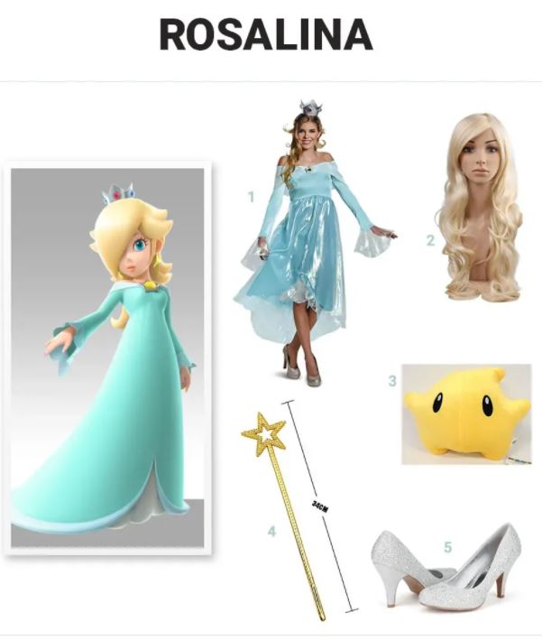 Rosalina woont in het Comet Observatory, dat ze bouwde met behulp van de eerste Luma die ze onder haar hoede nam. Van daaruit kan ze over de melkweg kijken en haar sterke krachten gebruiken waar nodig. Als je het uiterlijk van Rosalina uit Super Mario Bros wilt hebben, koop dan gewoon een blonde pruik, Rosalina-kostuum, klassieke pumps, Star Wand en een Luma Star.