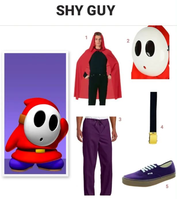 Cosplay een van de verlegen jongens met een rode cape met capuchon, paarse scrubbroek, militaire webriem, paarse bestelwagenschoenen en een verlegen jongensmasker. Jij bepaalt of de Shy Guys extreem griezelig of helemaal schattig zijn!