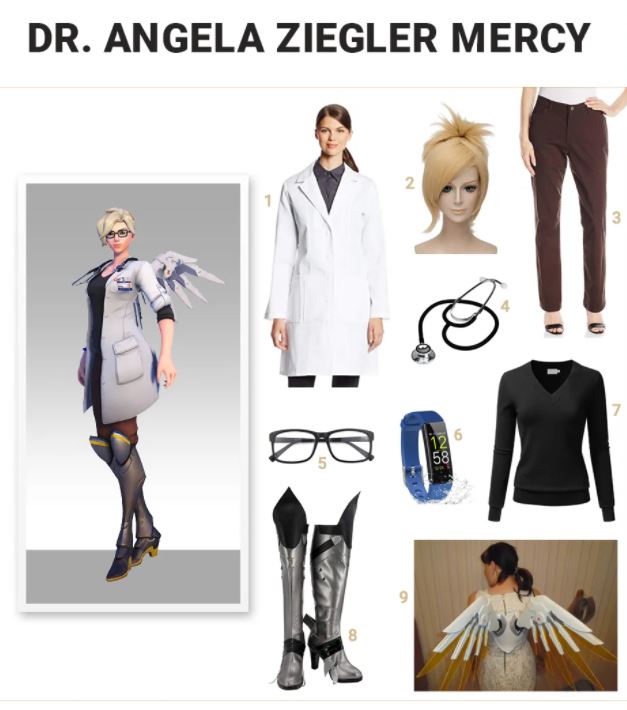 Mercy speelt een cruciale rol tijdens het spelen, ze heeft veel vaardigheden, waaronder 'Guardian Angel' en 'Angelic Descent'. Beschermengel is een van haar meest invloedrijke krachten, waardoor ze rechtstreeks naar gerichte teamgenoten kan vliegen, inclusief degenen die onlangs zijn geëlimineerd om de krachten van haar staf te gebruiken voor genezing. Haar ultieme vaardigheid is "Resurrect", waarmee ze geëlimineerde spelers uit de dood kan halen, waardoor ze volledige gezondheid en korte onkwetsbaarheid krijgen. Cosplay de look van de genezende dokter met een bruine broek, een zwarte trui en een witte laboratoriumjas. Voeg vervolgens een paar Mercy-laarzen, een Mercy blonde pruik en een paar Mercy-vleugels toe. Maak ten slotte de dokterslook af met een stethoscoop, een bril en een blauwe fitnesstracker.