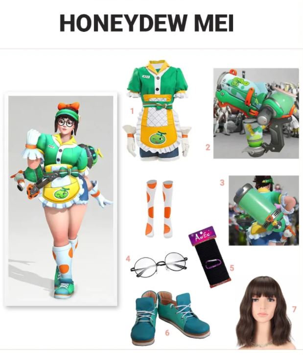 Ze draagt meestal een dik pak om haar tegen de kou te beschermen. Voor het 2019-jubileumevenement van de game konden spelers Mei in een heel andere look zien dankzij haar schattige en sexy Honeydew-outfit. Om bij de outfit van Honeydew te passen, moet je een groen uniform dragen van een bubble tea-winkel, een korte korte broek, een schort met stroken en handschoenen. Je essentiële kostuumaccessoires moeten een endotherme rugzak, endotherme blaster, bril met rond frame, haarelastiekjes, Honeydew Mei-schoenen en een pruik van bruin haar bevatten.