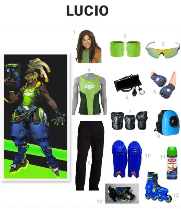 Cosplay Lucio's look met een Dreadlock-pruik, Lucio Green Shirt, Workout Handschoenen en Dri-Power Joggingbroek, Pols Zweetbandjes en Zonnebril. Koop dan alle accessoires van Lucio met een bloeddrukmanchet, cricketdijbeschermers, kniebeschermers, elleboogbeschermers, rolschaatsen, draagbare reistas voor huisdieren en een Lucio-wapen. Lucio's outfit is niet van deze wereld!