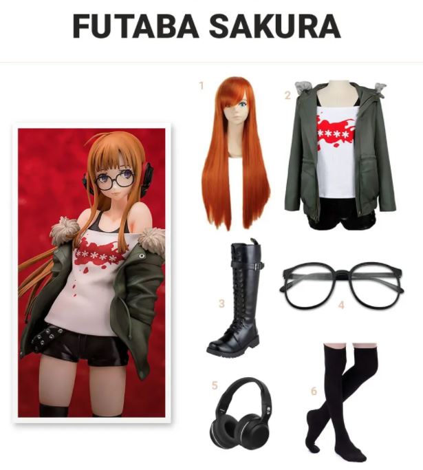 Futaba Sakura is merkbaar korter in vergelijking met andere meisjes in de Persona 5-anime. Haar typische outfit omvat een olijfkleurige jas met capuchon met bontrand, zwarte tanktop, witte crop top en zwarte korte broek. Afgezien van de oranje pruik, heb je waarschijnlijk kniehoge zwarte modieuze sokken, zwarte gevechtslaars en een koptelefoon.