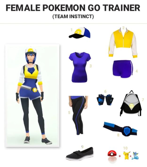 De dingen die je nodig hebt voor je vrouwelijke Instinct-kostuum zijn een Pokemon Go-honkbalhoed, een Pokemon Go gele trainer-hoodie, een geel T-shirt met ronde hals, een atletische katoenen short, een enkellange broek met streep, racefietshandschoenen, een Pokemon Go Pokeball-rugzak, een Pokemon Go riem en gesp, zwarte instappers en een speelgoed Pokeball.