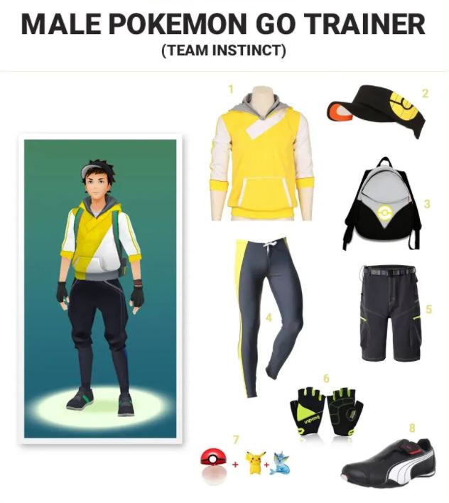 Als je deze Instinct-look wilt nabootsen, heb je een gele Pokemon Go-trainerhoodie voor heren, een Pokemon Go-trainervizier, een Pokemon Go-rugzak, een strakke fitnessbroek met gele streep, een losse korte broek, racefietshandschoenen, Pokemon-speelgoed nodig en een paar zwarte sneakers om de look af te maken en maak je klaar om wat Pokemon te vangen en het beste team samen te stellen.