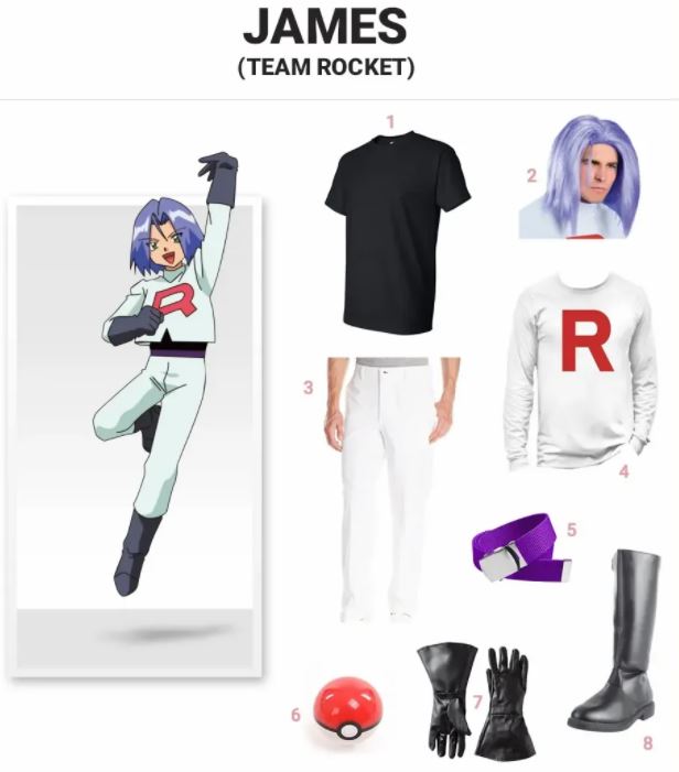 De dingen die je nodig hebt voor dit kostuum zijn een zwart t-shirt, een Pokemon James-pruik, een witte broek, een op Rocket geïnspireerd shirt met lange mouwen, een webriem, Pokeball, zwarte handschoenen en kapiteinslaarzen.