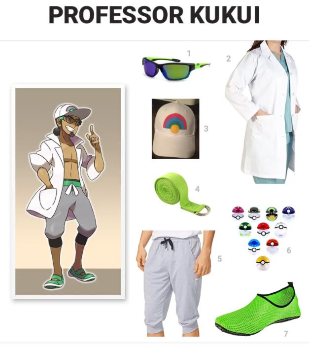 Ga shirtless als Kukui met een laboratoriumjas erop. Schuif in een driekwart joggingbroek met een groene yogaband. Je kunt trappen op een paar Barefoot Skin-schoenen. Kukui heeft altijd een zonnebril op, dus vergeet niet je golfzonnebril op te zetten. Hij is altijd te zien met zijn kenmerkende Pokemon-hoed met een regenboog op de voorkant. Zorg ten slotte dat je altijd wat Pokeballs bij de hand hebt! Groepscosplay met andere Pokemon-professoren zoals Professor Oak, Professor Willow en zelfs zijn vrouw Professor Burnet.
