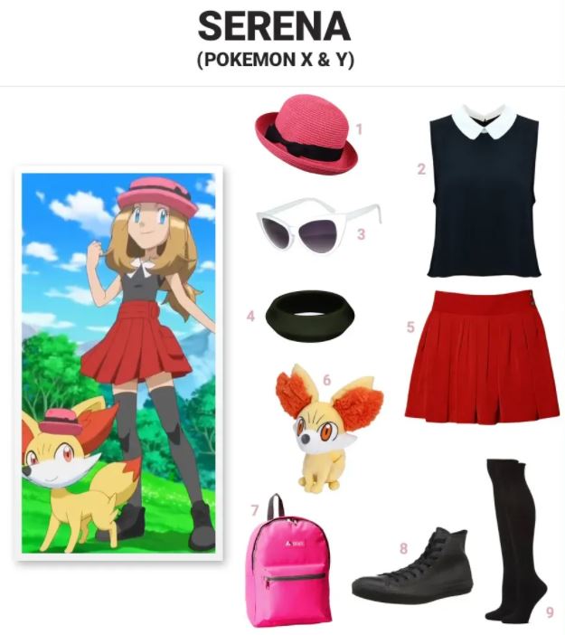 Naast een paar stukken uit de look van Serena, vind je de meeste items terug in je eigen kledingcollectie. We hebben elk stuk dat je nodig hebt online gevonden, dus degene die je niet bezit, kun je gemakkelijk vinden met een klik op de knop. Als je geen zwarte dijhoge kous, witte zonnebril, rode rok, zwarte sneakers of een zwarte armband hebt, kun je ze in veel alledaagse winkels bij jou in de buurt vinden. De items die je wilt bestellen om er zeker van te zijn dat ze zo veel mogelijk op Serena's outfit lijken, zijn de rode hoed, de tanktop met kraag, de roze rugzak of tas en de Pokemon Fennekin-pluche.