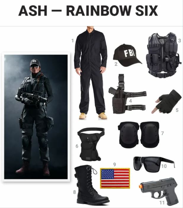 Eliza Cohen, codenaam Ash, is een aanvallende operator. Ze heeft een technische achtergrond die haar de overhand geeft in sloop en mechanisch onderhoud. Haar gretigheid om in de actie te zijn, kan soms haar ondergang zijn. Ze is impulsief, heeft een opvliegend karakter en staat erom bekend een beetje te zeker te zijn van haar capaciteiten. Wees klaar om te vechten als je verkleed bent als Ash uit Rainbow Six Siege. Volg de kostuumgids om een zwarte overall, tactisch vest, FBI-hoed, zonnebril, vingerloze handschoenen, patch met Amerikaanse vlag, kniebeschermers, laarzen, geweerholster, speelgoedgeweer en beenzakje te krijgen.