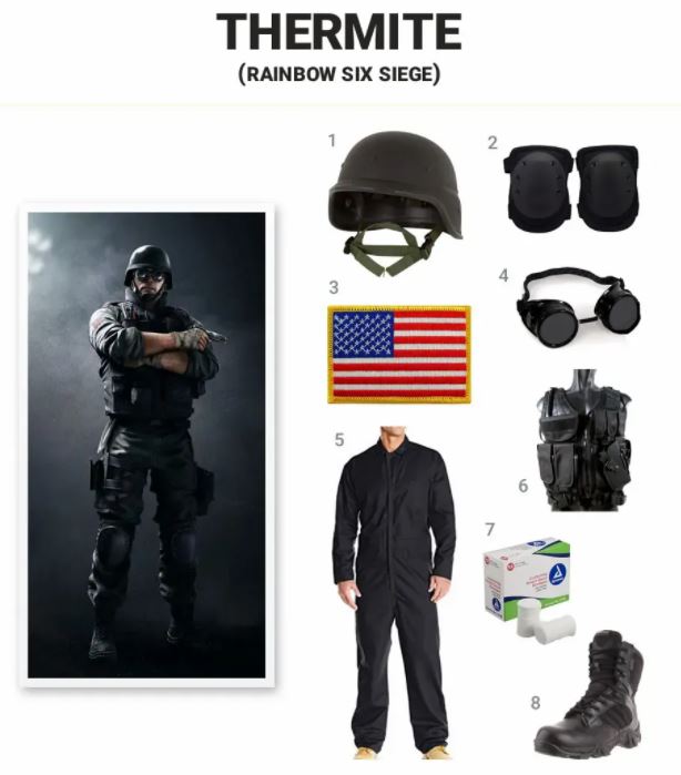 Als je denkt de uitdaging aan te gaan om je te kleden als het personage Thermite, heb je het volgende nodig: tactische ABS-helm, tactische kniebeschermers, patch met Amerikaanse vlag, acetyleenbril, MetalTac tactisch vest, overall van keperstof voor heren, conforme stretch Gaas en een paar waterdichte GTX-laarzen.