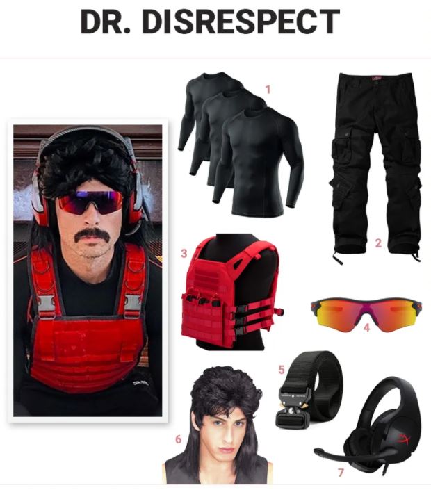 Krijg het uiterlijk van een van de beste streamers van internet met deze Dr. Disrespect-kostuumgids. Draag een zwart compressieshirt, een rood tactisch vest, een zwarte mul, een zwarte cargobroek, een tactische riem, een headset en een Oakley-zonnebril, en vergeet natuurlijk niet de iconische snor om het uiterlijk van Dr. Disrespect te evenaren.