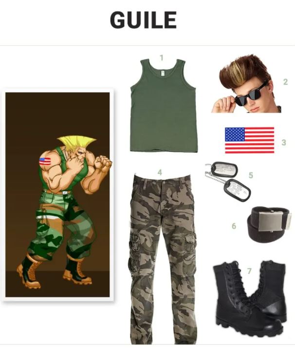 Guile is een hardcore man van de Amerikaanse luchtmacht, die hij graag bekend maakt met zijn American Flag-tatoeage. Je kunt bijna overal een goedkope, zelfklevende tatoeage vinden. Het belangrijkste onderdeel van het opnieuw creëren van Guile's uiterlijk is zijn haar; je kunt ofwel je haar sprayen om rechtop te staan als het lang genoeg is, of je kunt een pruik vinden die al lijkt op de look van Guile. Gooi gewoon wat stevige trappen en stoten om te laten zien dat je een echte Street Fighter bent!