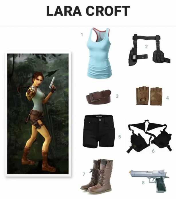 Om te beginnen met het opnieuw creëren van het kostuum, begin je met deze basic geribbelde racerback-tanktop, deze elastische broekzak, de NC Star Drop-beenholster voor je zwarte Airsoft-pistool, open knokkelvingerloze bruine leren handschoenen, vintage motorlaarzen met veters en een niet-leren jeans riem. Lara's outfit houdt haar voorbereid op avontuur en elk gevaar dat op haar pad komt. Ze kan gemakkelijk in haar kleding manoeuvreren, en nu kun je dezelfde look krijgen voor je volgende cosplay-evenement!