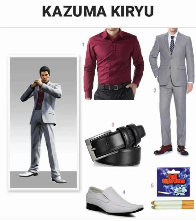 Niet alleen wordt hij door de yakuza opgejaagd vanwege zijn schijnbare verraad, maar hij moet ook andere misdaadfamilies tegengaan om de gestolen tien miljard yen van zijn oude Tojo-clan op te sporen. Als je de hoofdrolspeler, Kazuma Kiryu, uit de game Yakuza wilt cosplayen, moet je een bordeauxrood shirt, grijs pak, zwarte band, witte geklede schoenen en wat nepsigaretten kopen.